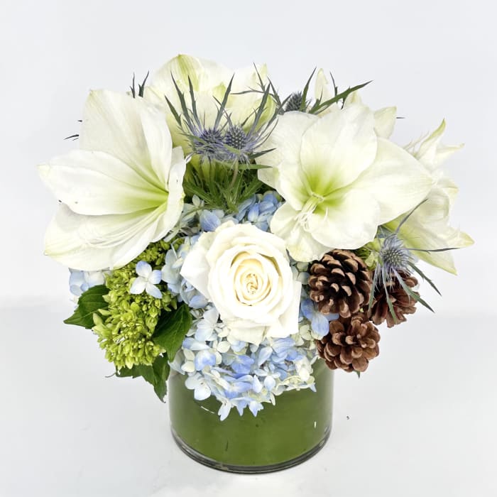 WINTER BLUES features blue and green hydrangeas, white amaryllis, roses with touches of blue thistles and pine cones.